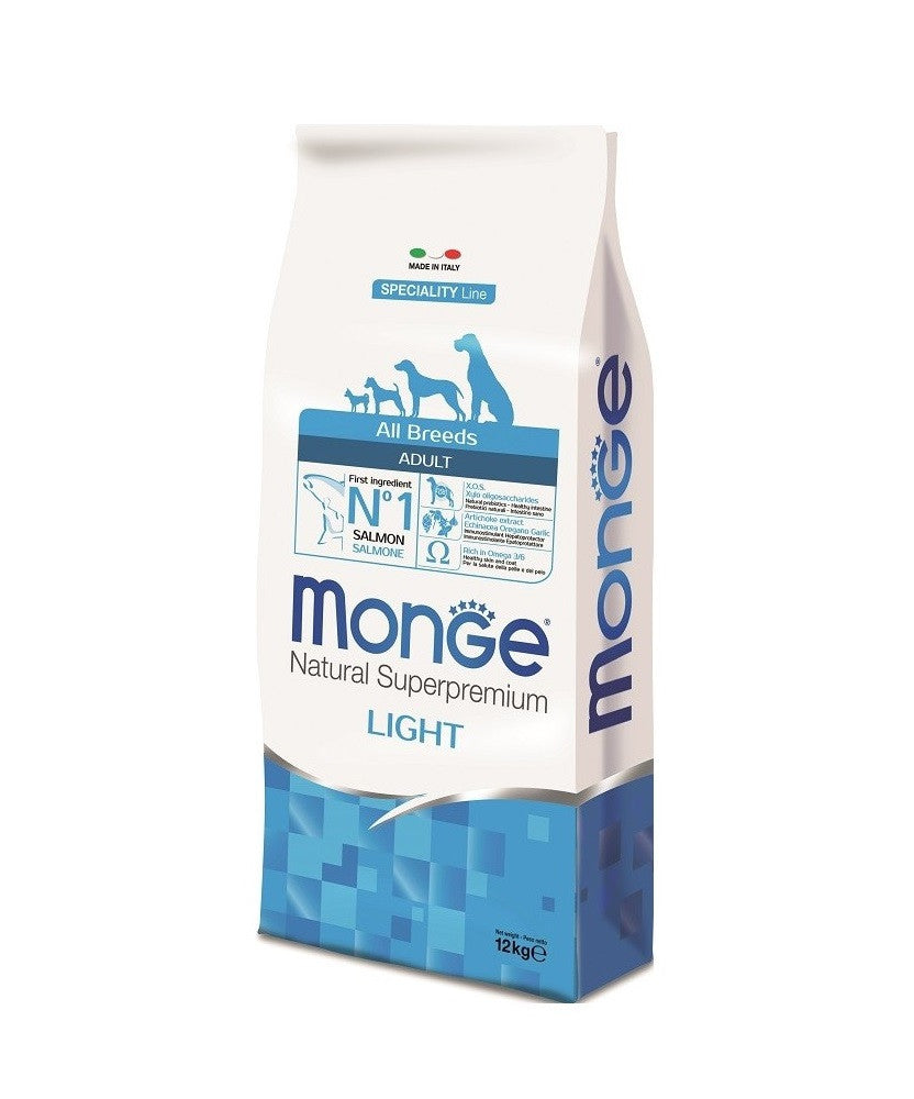 Crocchette per cani adulti di tutte le taglie con tendenza al sovrappeso o fabbisogni energetici ridotti. Monge Natural Superpremium Light per Cane Adult All Breeds con Salmone e Riso, ideale per cani grassi, contiene salmone fresco del mare del Nord come primo ingrediente e Xilo-oligosaccaridi per favorire la salute dell’intestino. Prodotto monoproteico e cruelty-free. Monge Natural Superpremium Light per Cane Adult All Breeds con Salmone e Riso è un mangime secco per cani adulti di tutte le taglie con problemi di sovrappeso o sedentari. Particolarmente indicato quindi per cani grassi che conducono una vita poco dinamica o sono naturalmente predisposti ad ingrassare. Altamente appetibili e ricche di ingredienti di altissima qualità, queste crocchette monoproteiche sono un toccasana per il benessere generale dei nostri amati amici a quattro zampe. Il primo ingrediente è il salmone proveniente dal gelido e incontaminato mare del Nord, arricchito con prebiotici naturali (X.O.S.) che svolgono un’azione benefica sulla flora batterica intestinale. Estratto di carciofo, echinacea, origano e aglio rafforzano le difese immunitarie e proteggono il fegato, Omega3 e Omega6 tutelano manto e cute, a garanzia di benessere e lucentezza. Le crocchette dietetiche Monge Natural Superpremium Light per Cane Adult All Breeds con Salmone e Riso - prive di OGM e additivi chimici, 100% prodotte in Italia - sono un alimento completo e bilanciato per cani adulti: salmone e riso garantiscono il giusto apporto di proteine e carboidrati; zinco e biotina assicurano il totale benessere dermatologico e contrastano patologie cutanee come forfora, prurito e dermatiti; infine fegato e sistema immunitario sono stimolati a svolgere la loro corretta funzionalità. Ottimali per ristabilire il peso forma di cani obesi o grassi.