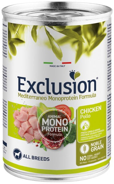 Exclusion Mediterraneo Monoprotein Formula – Noble Grain é un alimento completo e bilanciato formulato con una sola fonte proteica animale disidratata, per una ricetta chiara ed essenziale, e solo un cereale nobile di alta qualità. È preservato con antiossidanti naturali e integrato con Beta-glucani. È realizzato con una innovativa ricetta di Superfood della tradizione Mediterranea: Canapa, Olio d’Oliva, Pomodoro, Melagrana, Broccolo e Cicoria. Senza grasso di pollo, frumento, soia e mais aggiunti.